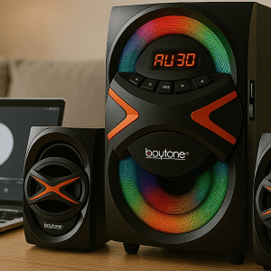 Boytone BT-326F, 2.1 Bluetooth Powerful Home Theater Speaker System, with FM Radio, SD USB Ports, Digital Playback, 40 Watts, Disco Lights, Full Function Remote Control, for Smartphone, Tablet., Black